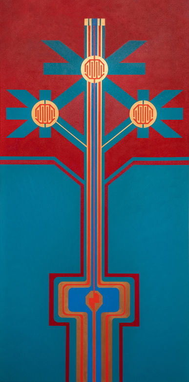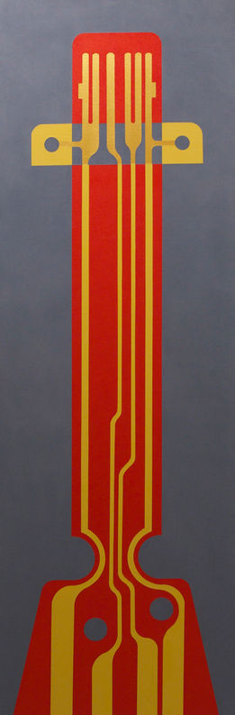 Rouzanna Berberian explores the relationship of culture and technology in her painting practice. She uses imagery from communication devices to underscore our daily interaction with analog and digital circuitry. Berberian is interested in technological innovations and devices such as Radio Frequency ID Tags, Bar Codes, and Flexible Circuit Boards. These objects facilitate data monitoring, collection, and storage.
